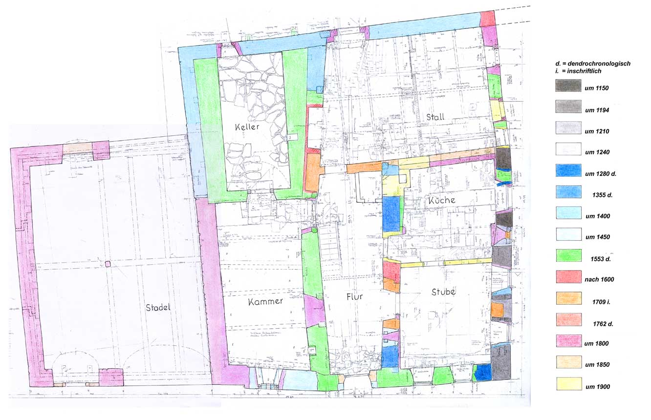 Wohnstallhaus Donaustrasse 56 in Oberndorf / Donau Die Zeichnung zeigt den Grundriss mit farblicher Unterscheidung der einzelnen Bauphasen (c) 2005-2009 Walter Kirchner